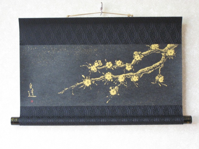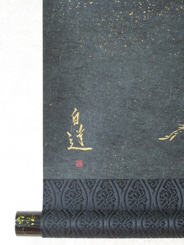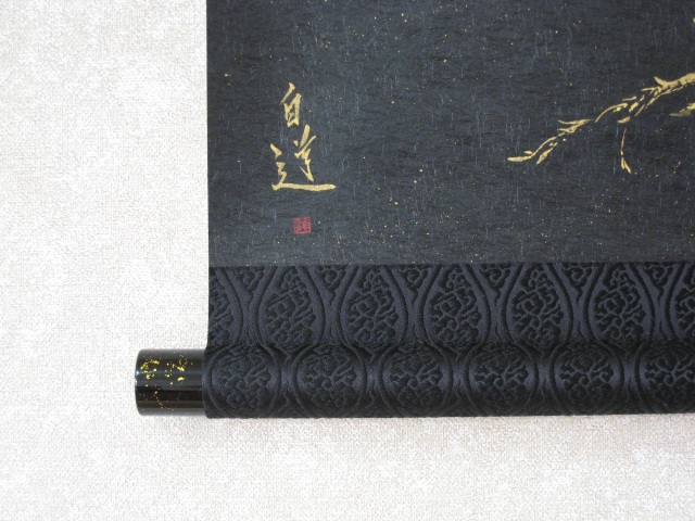天と地の黒色の反物と黒塗り金砂子の軸先で作品を引き締めます。