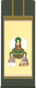 こちらの掛け軸 釈迦三尊図は大幅複製仏画・新品でございます。